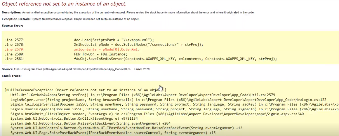 Error Object reference not set to an instance of an object, when login through axpert developer connecting to postgres